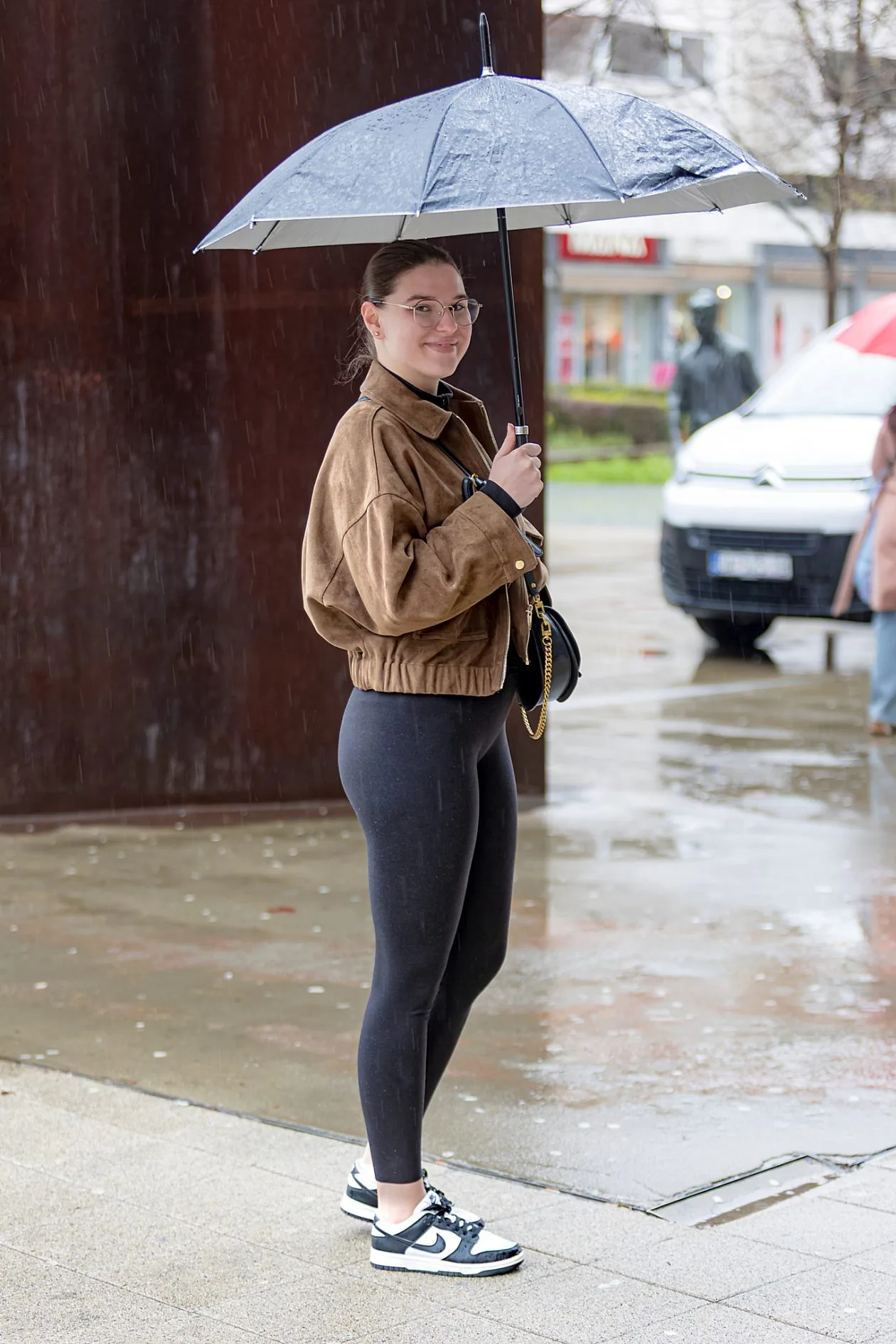 Smeđa oversized jakna od brušene kože pravi je hit ove sezone, a ova legica to dobro zna — kombinira je s crnim tajicama, Nike Dunk tenisicama i malom crnom torbom na zlatnom lancu koji je jedini potreban detalj za podizanje cijelog looka. Okrugle naočale i osmijeh bačen prema fotoaparatu čak i po kiši govore sve o njezinoj dozi samopouzdanja.