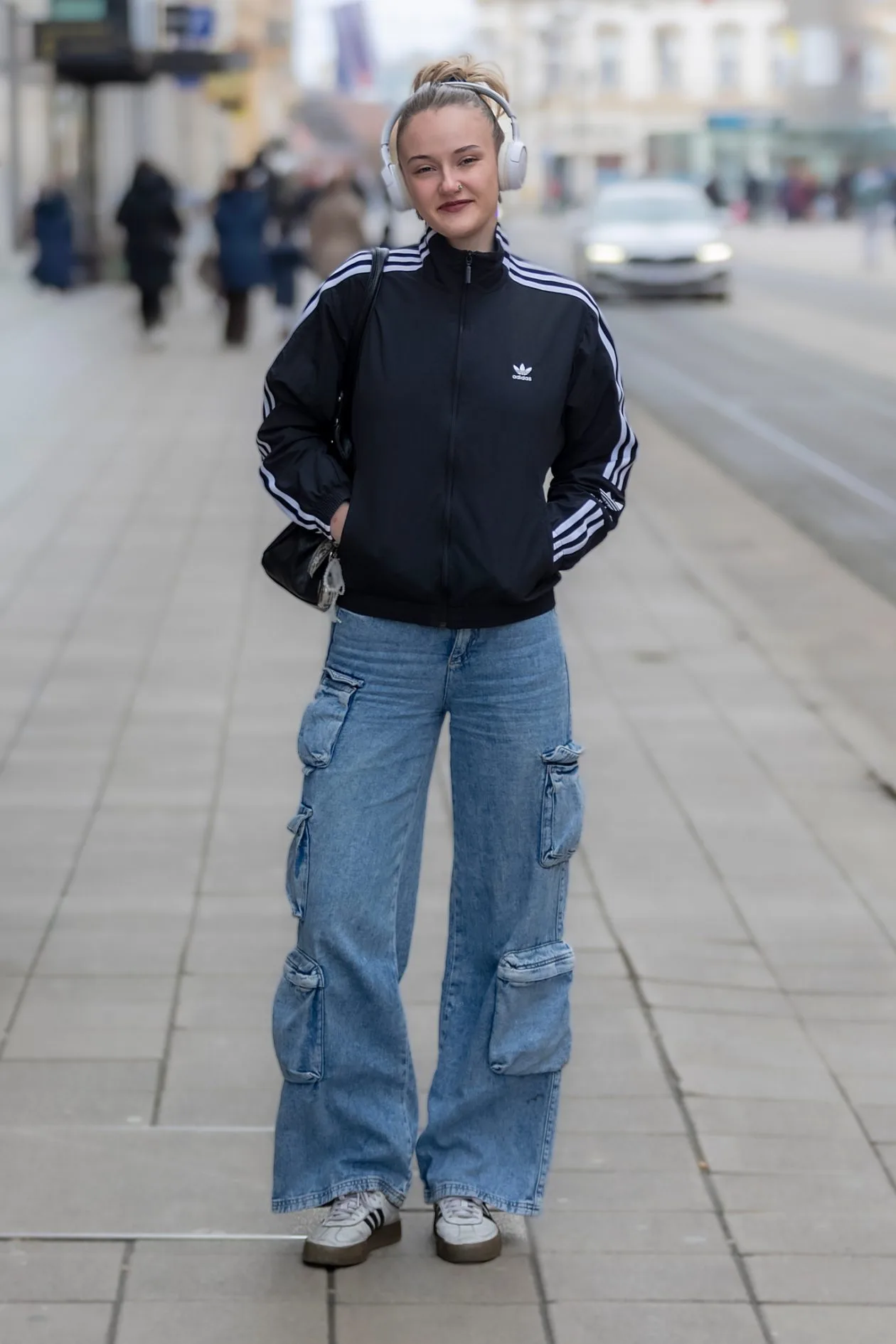 U ovoj kombinaciji dominira pravi povratak Y2K stila, ali u ležernoj, modernoj verziji. Široke cargo traperice s naglašenim džepovima daju joj street–style energiju, dok klasična sportska trenirka s tri pruge drži look u prepoznatljivom, retro sportskom tonu. Velike slušalice preko ušiju nisu samo praktične, nego i totalni it-dodatak koji zaokružuje vibe djevojke koja žuri svojim ritmom, u vlastitoj zoni, kroz gradski kaos. Casual, cool i maksimalno autentično – baš kako volimo u Legici dana.