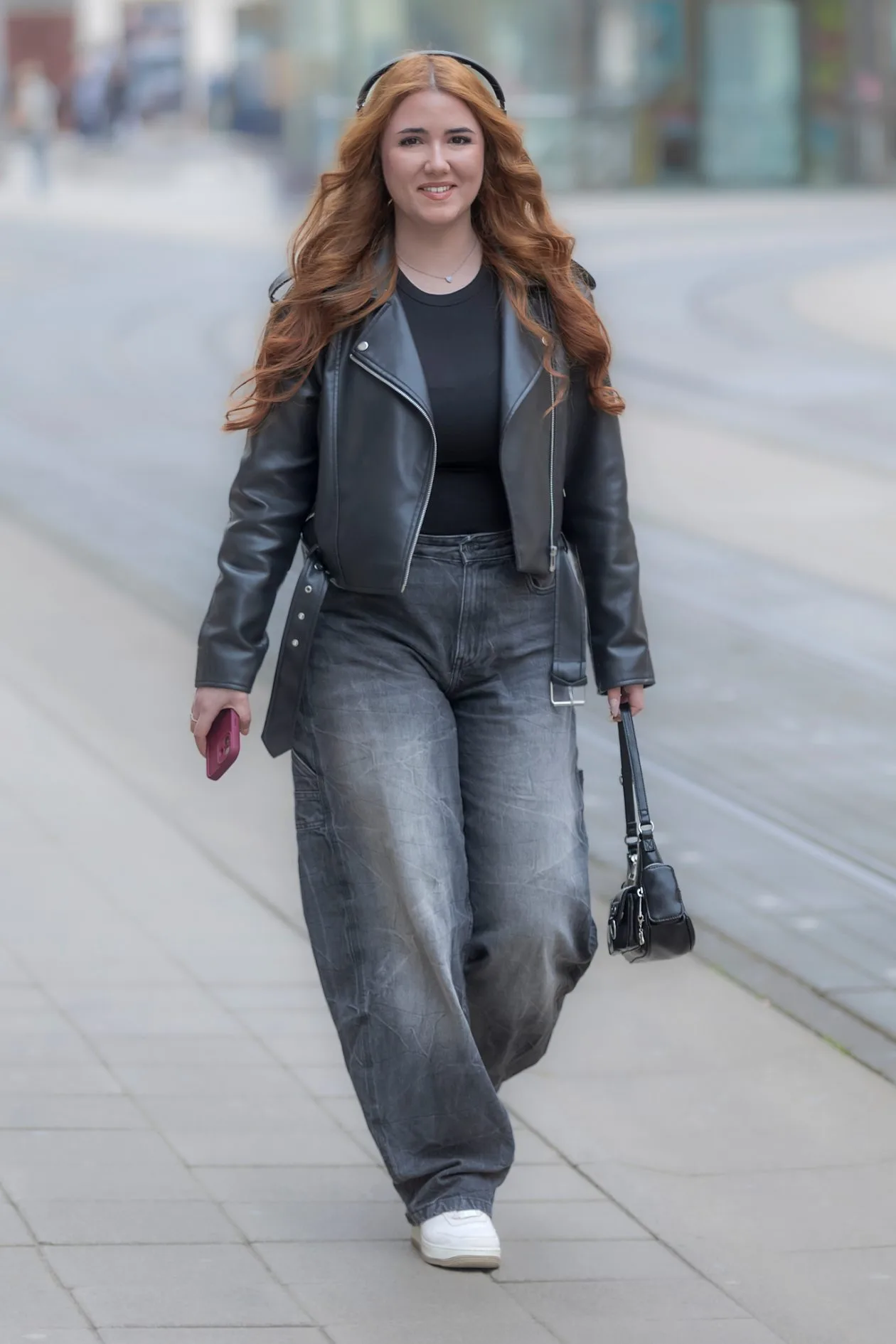 Legica na sebi nosi pravi city rebel moment, ali s dozom ženstvene mekoće. Crna kožna jakna daje outfitu onaj bezvremenski “cool girl” stav, dok jednostavna crna majica drži sve minimalno i čisto. S druge strane, široke sive traperice unose opuštenost i lagani vintage štih, kao da je kombinacija spontano složena, a zapravo savršeno pogođena. Valovita kosa i slušalice dodaju dinamiku, kao da ide kroz grad uz svoj soundtrack, potpuno svoja. Mala torbica i tenisice samo potvrđuju — ovo je look za svaki dan, ali s karakterom koji se ne zaboravlja.