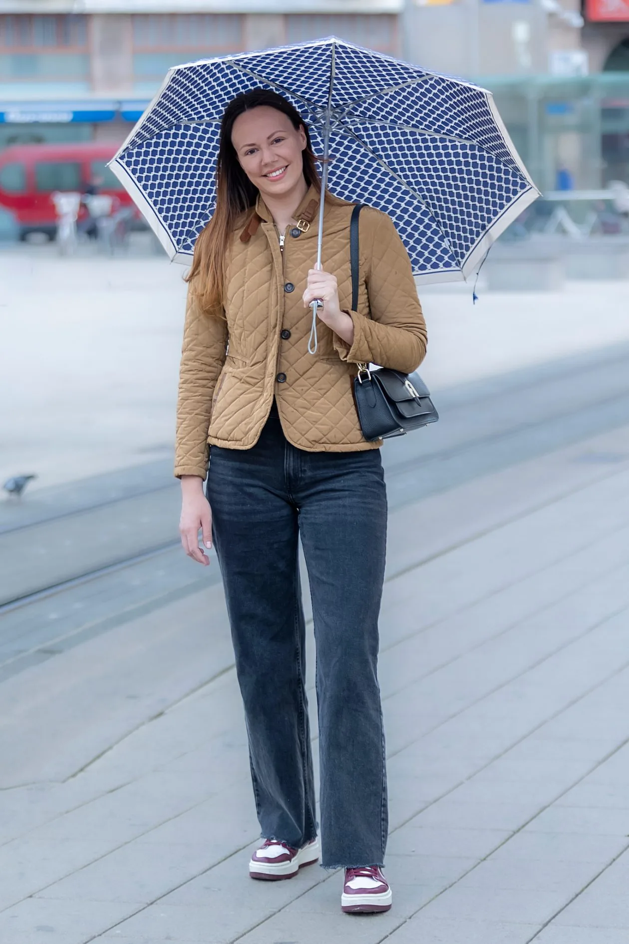 Kamel quilted jakna s konjskim ovratnikom klasičan je engleski komad koji nikad ne izlazi iz mode, a uz tamnosive wide leg traperice i crnu structured torbicu na zlatnom okovu djeluje elegantno bez pretjerivanja. Bordo-bijele platform tenisice jedini su neočekivani detalj koji cijelom looku daje osobnost, a plavo-bijeli kišobran s geometrijskim uzorkom savršen je završni akord jednog promišljeno složenog proljetnog outfita.