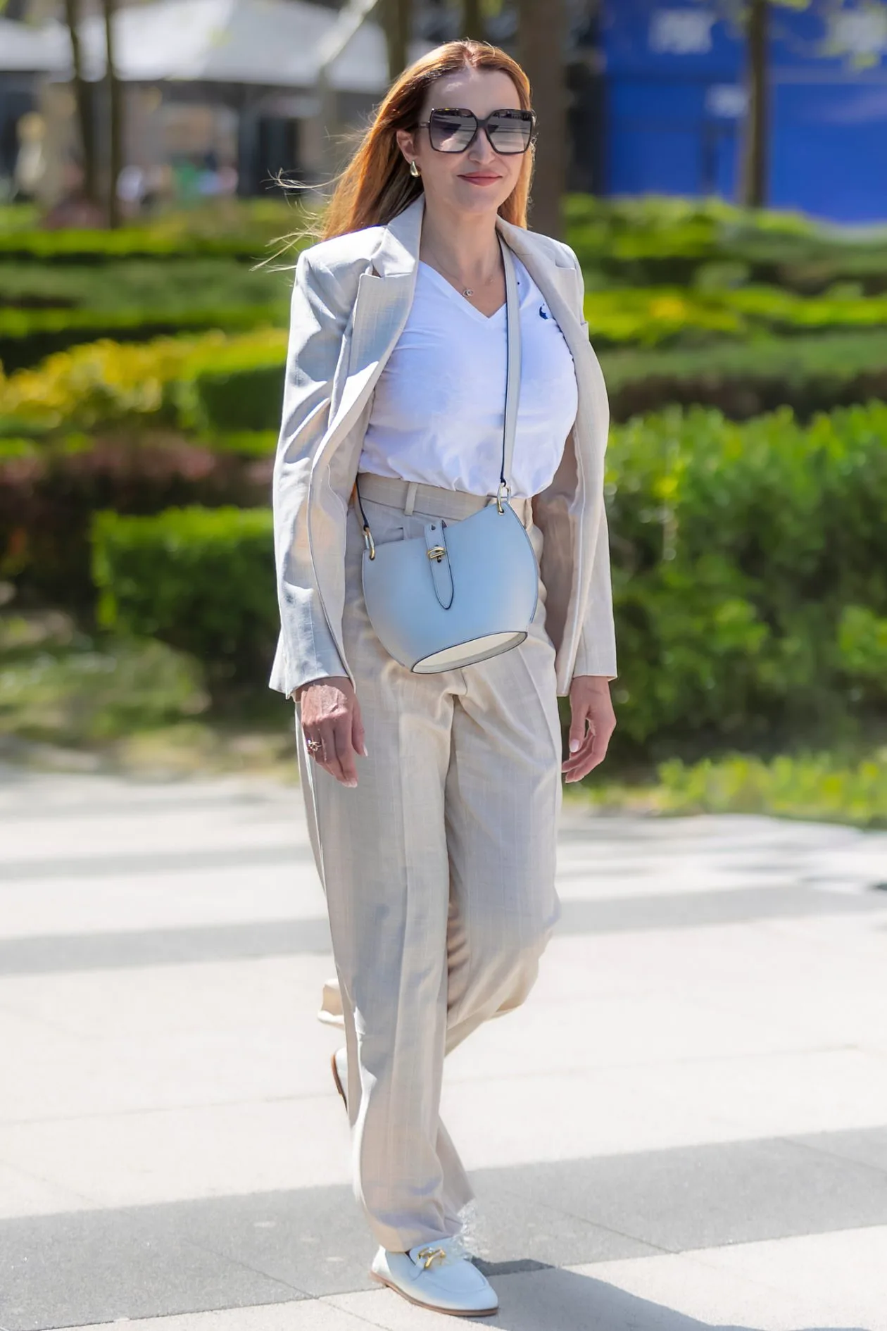 Bež laneno odijelo s bijelom majicом savršena je proljetna formula, a ova legica podiže ga na višu razinu jednim pametnim detaljom — baby blue bucket torbica i matching loaferice s zlatnom kopčom unose nježnu notu boje u inače neutralan look. Oversized kornjačaste naočale i vatreno crvena kosa završni su elementi žene koja točno zna kako izgledati elegantno bez napora.
