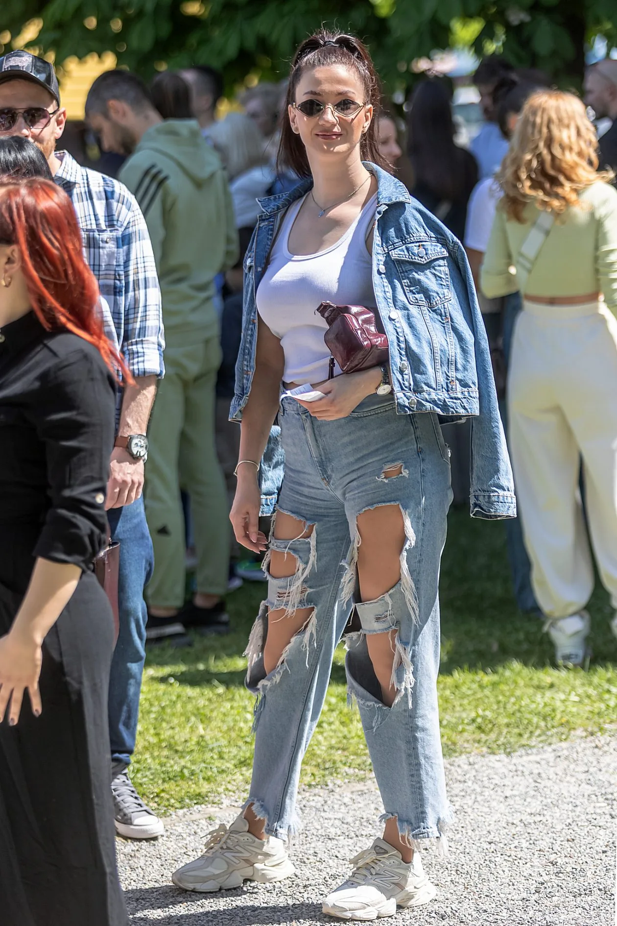 Denim na denim kombinacija s dozom bunta — oversized traper jakna nosi se opušteno uz agresivno ripped traperice visokog struka koje su definitivno najglasniji komad u ovom looku. Bijeli tank top, bordo lakirana mini torbica, sitne ovalne naočale i visoka punđa s mašnom daju joj dozu devedesetih, a New Balance tenisice savršen su sportski završetak jedne bezbrižne ljetne kombinacije.