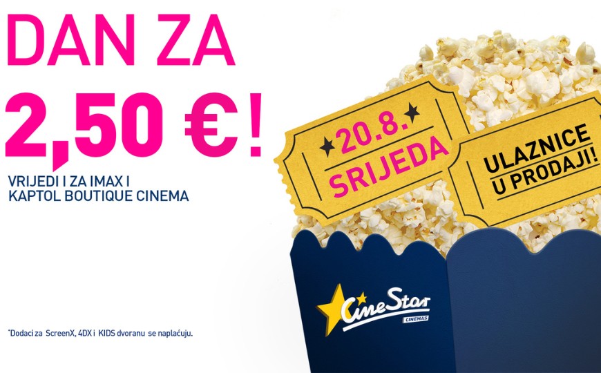 Dok se godišnji odmori polako bliže kraju, u Portanovi zabava tek počinje! Ove srijede, 20. kolovoza, CineStar u Portanovi priprema poseban filmski doživljaj koji se ne propušta – svi filmovi po cijeni od samo 2,50 eura! Na repertoaru vas očekuje raznolik program, od uzbudljivih blockbustera i akcijskih avantura, do zabavnih animiranih hitova i domaćih naslova. Ulaznice su već u prodaji online i na blagajnama kina – odaberite film, okupite ekipu i uživajte u kinu po super cijeni!