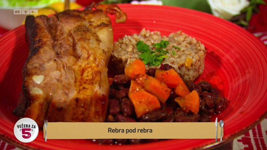 Buco je pripremu večere započeo glavnim jelom ‘Rebra pod rebra’. Marinirana svinjska rebra pekao je u pećici, a zatim pripremio priloge – heljdinu kašu, grah i mrkvu te dodatni umak za rebarca. Zlatko je komentirao kako bi volio da za prilog budu poslužen pekarski krumpir, ali ispravno je pretpostavljao da će prilog biti heljda.
