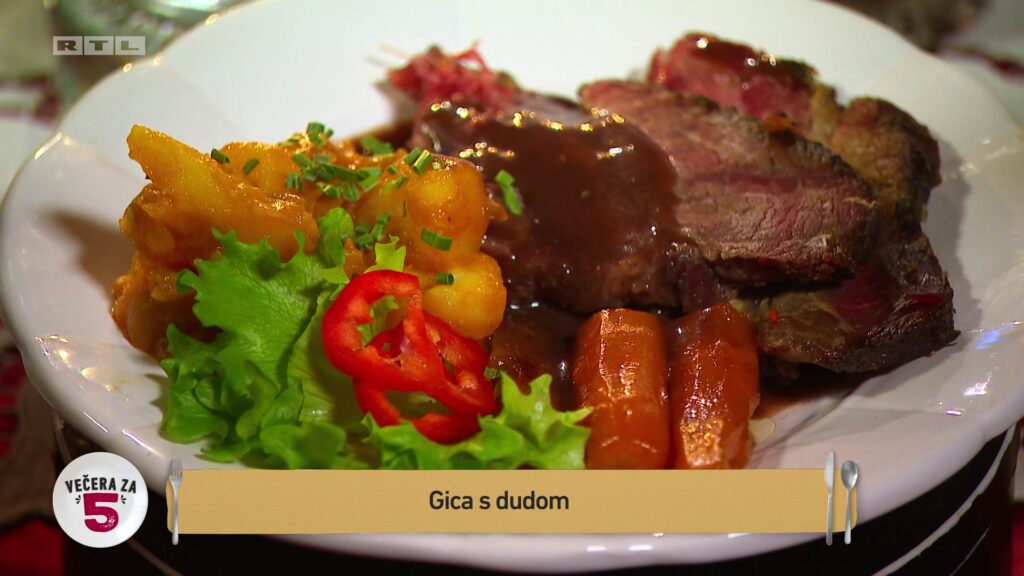 Večerašnja domaćica pripremu svoje večere započela je glavnim jelom Gica s dudom’, a riječ je bila o pečenom dimljenom svinjskom vratu s umakom od dudovog pekmeza i temeljca. Kao prilog je pripremila restani krumpir i kupus salatu s hrenom.