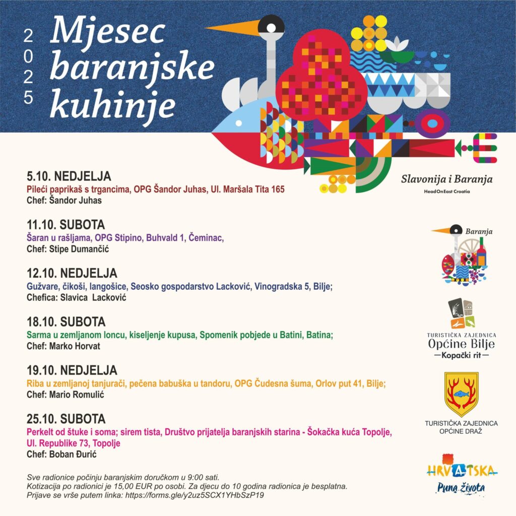 Baranja i ove godine poziva posjetitelje na poseban gastronomski program koji će svake subote i nedjelje u listopadu predstavljati najbolje od lokalne tradicije i kulinarstva. Na meniju su autentična jela pripremljena prema starinskim receptima, a posjetitelji će imati priliku učiti i kuhati uz baranjske majstore kuhače.