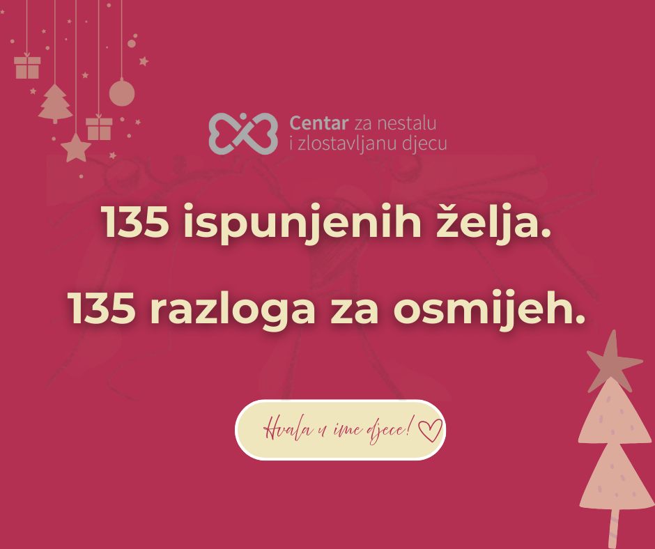 Zahvaljujući ljudima koji vjeruju da svako dijete zaslužuje osmijeh i priliku ispunjeno je 135 želja. Upravo njima, poručuju iz Centra, posebno zahvaljuju. Neka im blagdansko vrijeme donese ljubav, mir i zajedništvo jer svojim su činom pokazali da upravo to i zaslužuju.