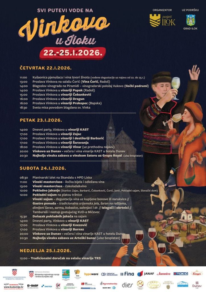 Od 22. do 25. siječnja 2026. svi putevi vode u Ilok, koji ponovno otvara svoja vrata tisućama ljudi željnih uživanja u autentičnim iskustvima. Blagdan sv. Vinka, zaštitnika vinogradara, već tradicionalno okuplja ljude iz cijele Hrvatske, a grad i okolne vinarije pretvaraju se u središte gastronomskog užitka, autohtonih vina i nezaboravnih večeri.