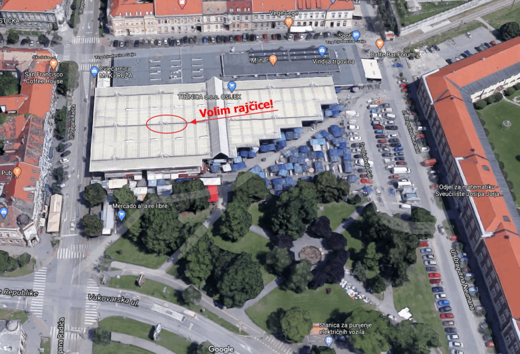 GDJE: Tržnica Osijek, glavna osječka tržnica na Gajevom trgu – na EKO trgu (iza klupa s cvijećem).