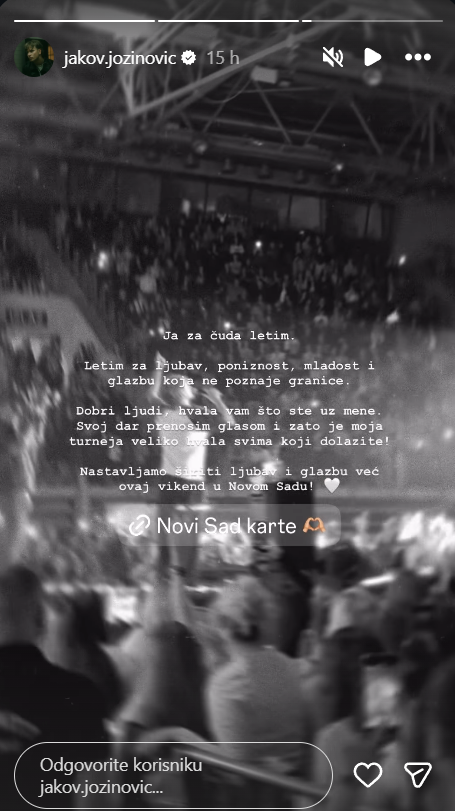 “Ja za čuda letim. Letim za ljubav, poniznost, mladost i glazbu koja ne poznaje granice”, napisao je pjevač. “Dobri ljudi, hvala vam što ste uz mene. Svoj dar prenosim glasom i zato je moja turneja veliko hvala svima koji dolazite. Nastavljamo širiti ljubav i glazbu već ovaj vikend u Novom Sadu”, dodao je Jozinović.