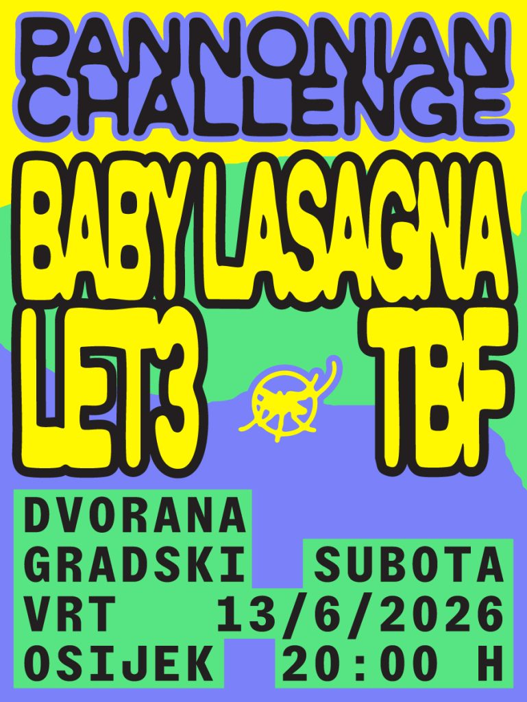 U subotu, 13. lipnja, u dvorani Gradski vrt publiku očekuje nastup Baby Lasagne, koji po prvi put dolazi u Osijek, uz nezaobilazne Let 3 i TBF.