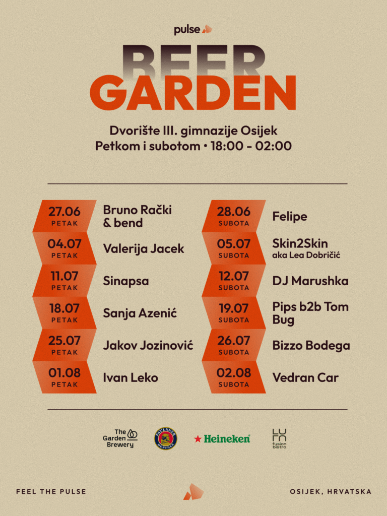 Pulse Events vam predstavlja Beer Garden – jedini ljetni pivski vrt u gradu! Od 27. lipnja do 2. kolovoza, svakog petka i subote od 18 do 02 sata, uživamo u dvorištu Matematičke gimnazije u Osijeku.
