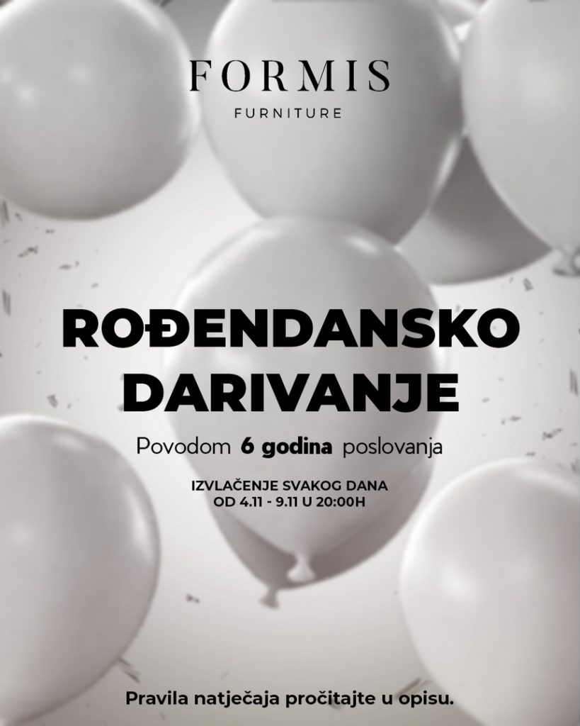 Osim popusta u salonu, Formis je svojim pratiteljima pripremio i rođendanski giveaway na društvenim mrežama, u kojem se mogu osvojiti vrijedne nagrade, uključujući i glavnu nagradu – krevet Como. Sve detalje o nagradnoj igri, pravilima sudjelovanja i nagradama možete pronaći na službenim kanalima Formis Furniturea – Instagram i Facebook.