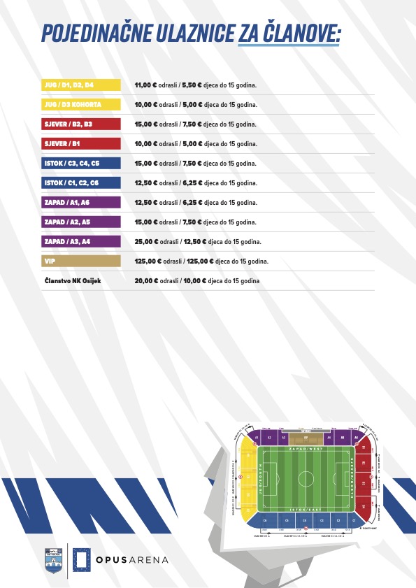 Ulaznice za utakmicu NK Osijek – HNK Rijeka dostupne su na stadionskim blagajnama – Ticket pointu od srijede do petka, u vremenu od 10 do 18, te u subotu na dan utakmice od 15 do 22 sat. Ulaznice je moguće kupiti i online