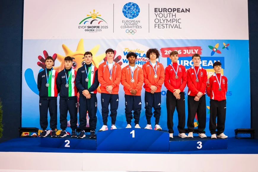 Velika Britanija osvojila je prva dva zlata na gimnastičkom EYOF-u u Osijeku! Evan McPhillips višebojski je prvak Europskog olimpijskog festivala mladih, baš kao i britanska momčad u čijem sastavu su na vrh postolja uz Evana stali i Radell Fawzi Zakaine i Uzair Chowdhury (158.500 bodova).