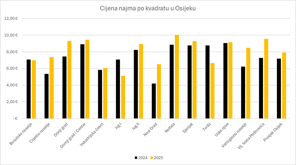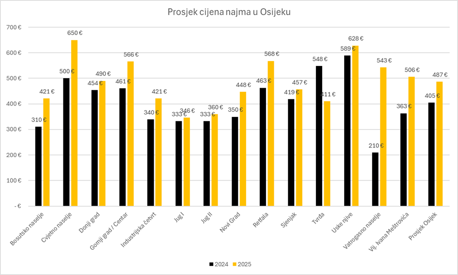 Najveći prosječni pad najamnina je za Tvrđu i to za 25%, pa je tako ondje najam ove godine bio najjeftiniji od svih osječkih naselja s prosječnom traženom cijenom od 411 eura. Kvartovi u Osijeku u kojima ćete mjesečni najam plaćati manje od 400 eura mjesečno su Jug I i II.