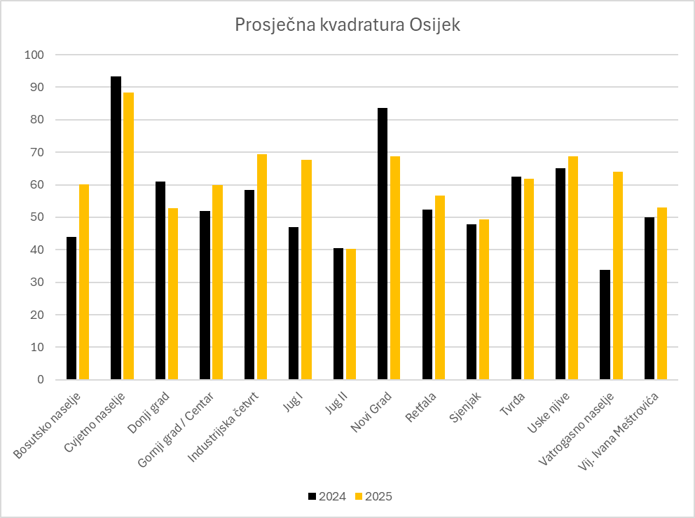Prosječna kvadratura stanova za najam u ponudi u Osijeku ove godine iznosi 61 kvadrat, dok je prošlogodišnji prosjek bio 56 kvadrata. Najveća prosječna kvadratura je u Cvjetnom naselju, gdje iznosi 88 kvadrata, a najmanja na Jug II gdje iznosi 44 kvadrata. Stanove od gotovo 70 kvadrata može se pronaći u Industrijskoj četvrti, Jug I, Novom Gradu i Uskim njivama.