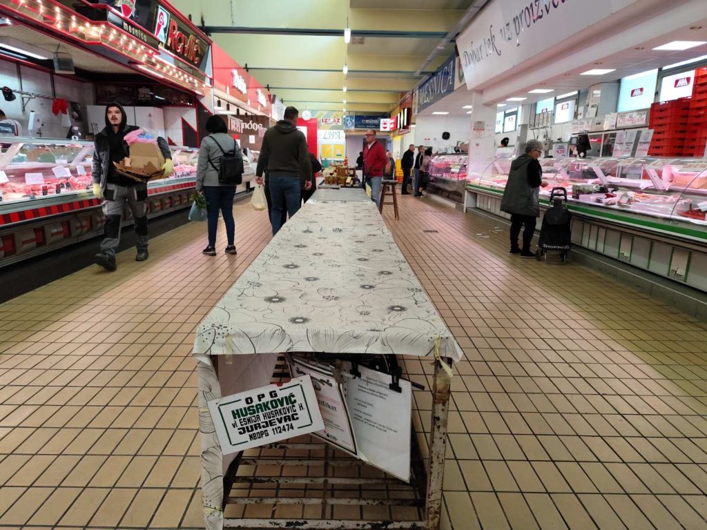Naime, uobičajene ponude na zapadnome dijelu tržnice i to četvrtkom kad je broj kupaca uglavnom zadovoljavajuć, nema. Zatekli smo prazne stolove, ondje gdje se godinama prodaju suhomesnati proizvodi, baš kao i na početku klupa u zatvorenome dijelu tržnice.
