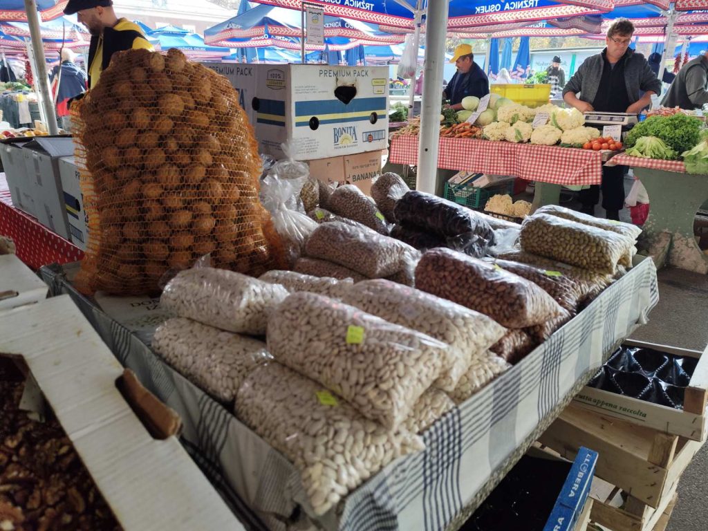 I raznovrsno voće je u ponudi i to po tri eura za grožđe i šipak, dok kilogram šljiva stoji 1,5 euro, a tri kilograma prodavači traže za kilogram krušaka.