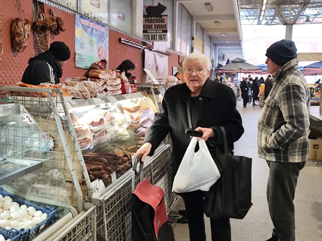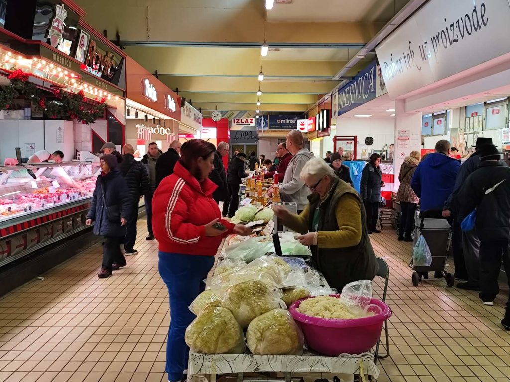 I u zatvorenome dijelu tržnice vladala je velika gužva i to ne samo radi uobičajenih prodavača kiseloga kupusa i meda, već i ponude u mesnicama. Domaći odojak (trenutno) se prodaje za 6,99 eura, a dobra je i ponuda junetine, iako je cijena nešto via. Lopatica i koljenica od te vrste mesa stoji 14,99 eura za kilogram.