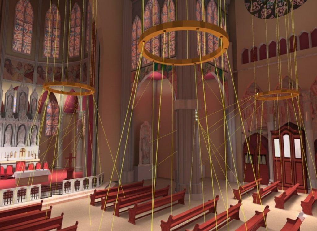 Rasvjetna tijela su promjera tri metra te iz donje plohe funkcionalno obasjavaju klupe i međuprostor u sve tri lađe, a s gornje strane ostvaruju ciljanu ambijentalnu rasvjetu prema pomoćnim oltarima i freskama.