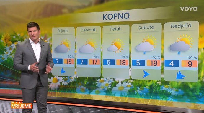 Na istoku zemlje zadržat će se dosta oblaka, uz povremena sunčana razdoblja. Do večeri je izgledna mjestimična kiša ili kratkotrajni pljuskovi, osobito u Posavini i oko slavonskog gorja. Uz umjeren sjeveroistočni vjetar, temperature će se kretati između 12 i 15 °C.