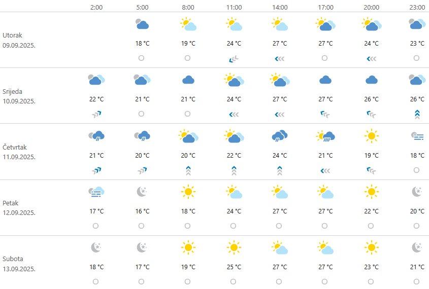 U drugom dijelu dana oblaka će biti sve više i to u zapadnijim dijelovima unutrašnjosti. Uz granicu sa Slovenijom krajem dana mogući su i lokalni pljuskovi. Temperatura ostaje iznadprosječna, uglavnom od 25 do 27 Celzijevih stupnjeva.