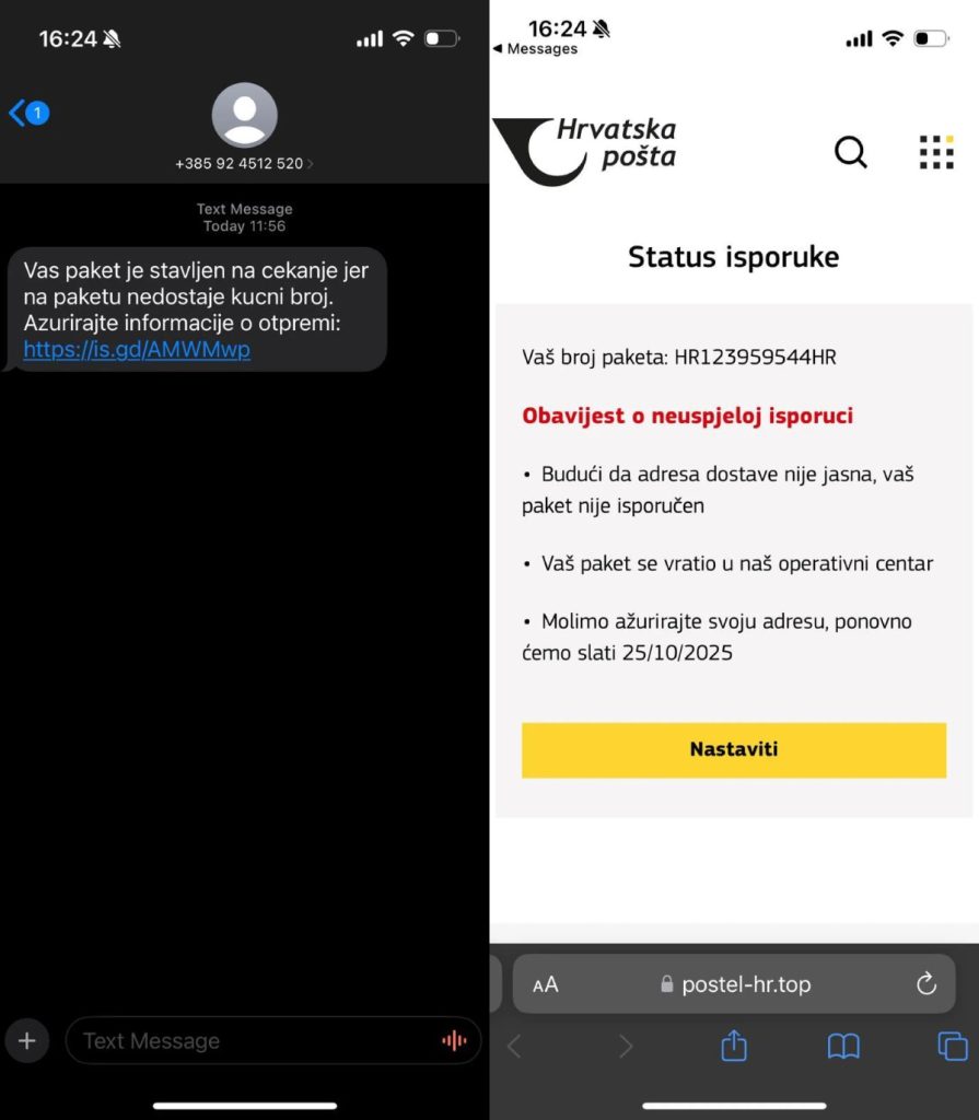 U porukama, koje izgledaju kao da ih šalje Pošta, korisnike se poziva da “ažuriraju podatke o paketu” ili da “potvrde dostavu”, a sve putem poveznice koja vodi na lažne internetske stranice. Cilj prevaranata je, upozoravaju iz Hrvatske pošte, krađa podataka i novca građana.