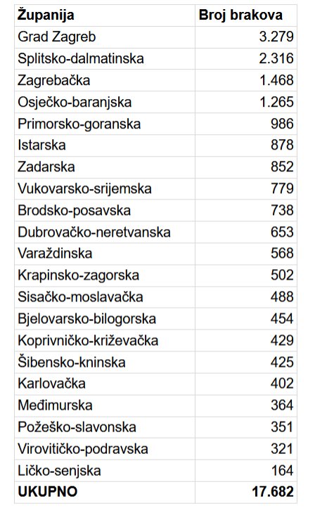 Promatrajući podatke po županijama, najviše brakova sklopljeno je u Gradu Zagrebu – ukupno 3.279. Slijede Splitsko-dalmatinska županija s 2.316 vjenčanja, Zagrebačka županija s 1.468 te Osječko-baranjska županija s 1.265 sklopljenih brakova, što je 70 više nego godinu prije.