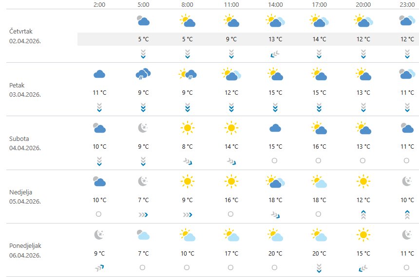 U petak još višak oblaka i povremena kiša uglavnom u prvom dijelu dana, no vjetar postupno slabi, a temperatura raste. Za uskrsni vikend u Slavoniji i Baranji pravo proljetno vrijeme — toplo, pretežno sunčano i do 19 stupnjeva. U novom tjednu još i vedrije.