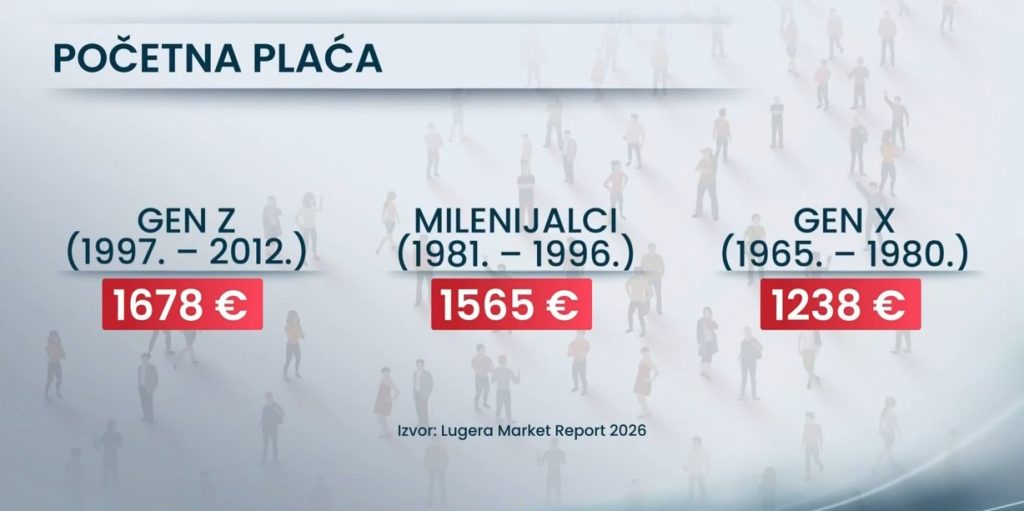 Podaci agencije za zapošljavanje pokazuju i razlike u početnim plaćama među generacijama. Generacija Z sa srednjom stručnom spremom ima medijan bruto početne plaće od gotovo 1700 eura, milenijalci nešto manje od 1600 eura, dok generacija X u prosjeku ima tek nešto više od 1200 eura.