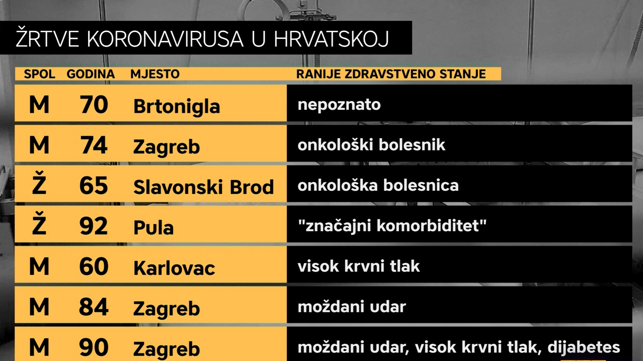 Najmlađi umrli je 60-godišnjak iz Karlovca, koji je imao visok krvni tlak. Zadnja su dva pacijenta umrla u KB Dubrava, prvo 84-godišnji muškarac koji je ranije imao moždani udar
