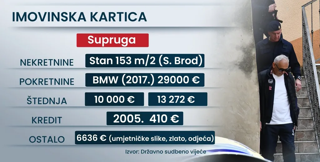 Na ženi je stan od 150 kvadrata u Brodu. BMW iz 2017. vrijedan 29 tisuća eura, 23 tisuća eura štednje i kredit s ratom od 410 eura. Prijavila je i 6636 eura vrijedne slike, zlato i odjeću koji su navedeni kao dar.