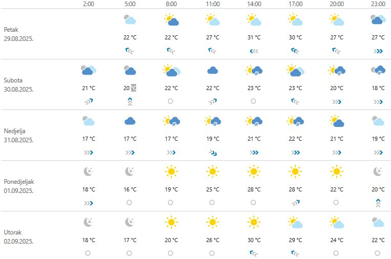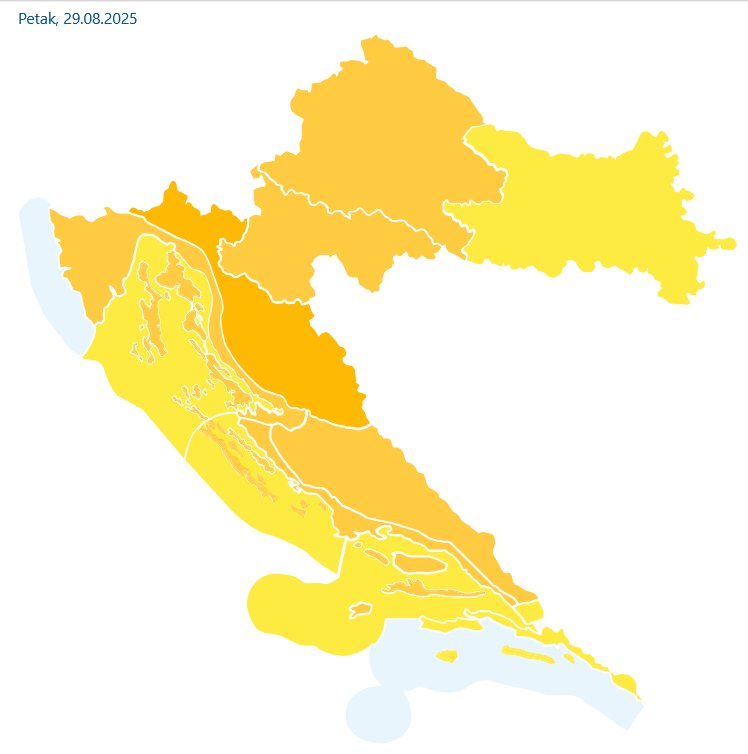 Na istoku zemlje danas još uvijek vrlo vruće i sparno, osobito u Podunavlju, čak do 34, moguće i 35 °C. No, stiže postupno naoblačenje sa zapada, sve izgledniji mjestimični pljuskovi, sjeverozapadnjak, a krajem dana oko slavonskog gorja moguće i nevrijeme zbog čega nam je DHMZ izdao i žuti meteoalarm.
