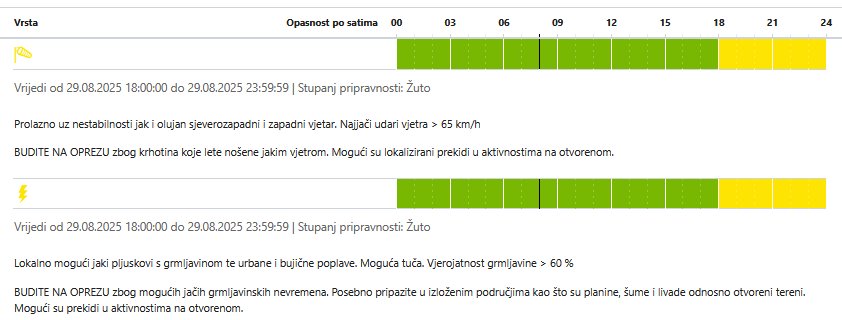 Meteoalarm se pali danas u 18h i vrijedit će i cijelu subotu. Lokalno su mogući jaki pljuskovi s grmljavinom te urbane i bujične poplave. Moguća je tuča. Puhat će olujan sjeverozapadni i zapadni vjetar.
