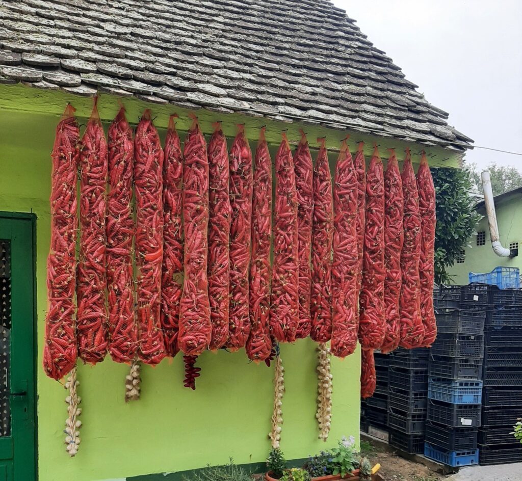 Poput ogromnih kobasica obješeno je na desetke, ako ne i stotine kilograma paprike koje će naposljetku završiti u sušari a potom samljeti u vrhunsku začinsku papriku.