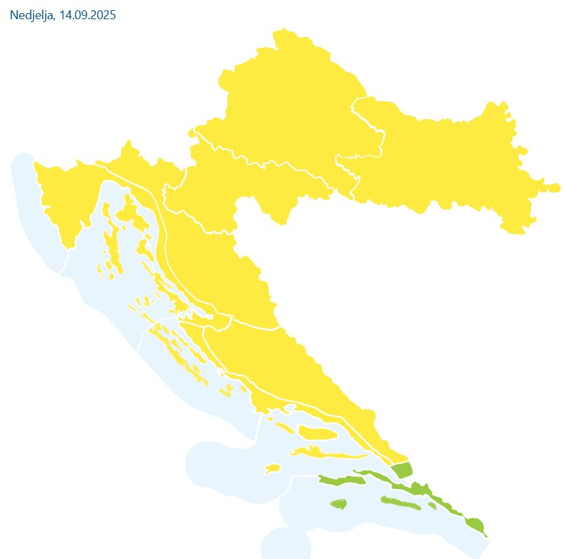 Državni hidrometeorološki zavod izdao je za svih pet slavonskih županija žuti meteoalarm. Upozorenje vrijedi od podneva do 20 sati zbog mogućih izraženijih pljuskova s grmljavinom te prolazno snažnog sjeverozapadnog vjetra.
