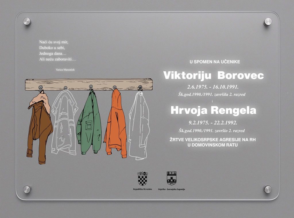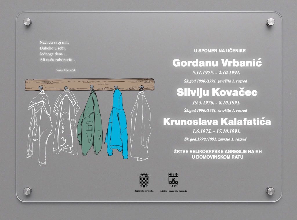 U školama diljem Osječko-baranjske županije postavljeno je 17 spomen-ploča koje trajno čuvaju sjećanje na 21 dijete poginulo tijekom Domovinskog rata. Ploče podsjećaju na mlade živote prekinute prerano – na djecu čija su imena nekada krasila školske dnevnike, odjekivala hodnicima i rasla uz svoje vršnjake, a čije je djetinjstvo završilo ratom i agresijom.