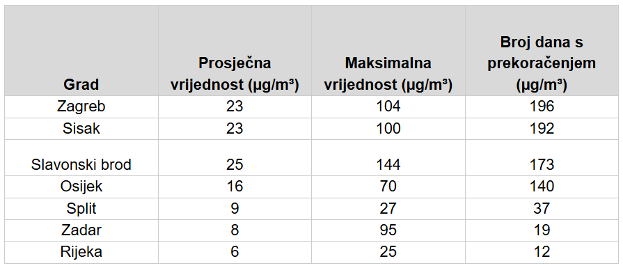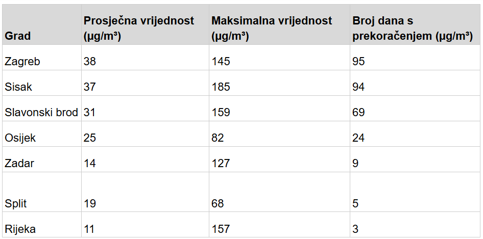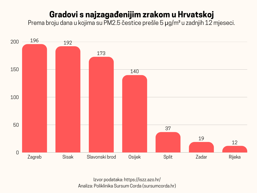 Najgoru situaciju bilježe Zagreb, Sisak i Slavonski Brod, gdje je zabilježeno između 170 i 196 dana prekoračenja PM2.5 vrijednosti. To znači da su stanovnici tih gradova gotovo svaki drugi dan tijekom godine bili izloženi zraku koji se smatra štetnim za zdravlje. Na drugom kraju ljestvice nalazi se Rijeka, s 12 dana prekoračenja, što je najbolji rezultat u državi, ali i dalje trostruko gori od WHO standarda.