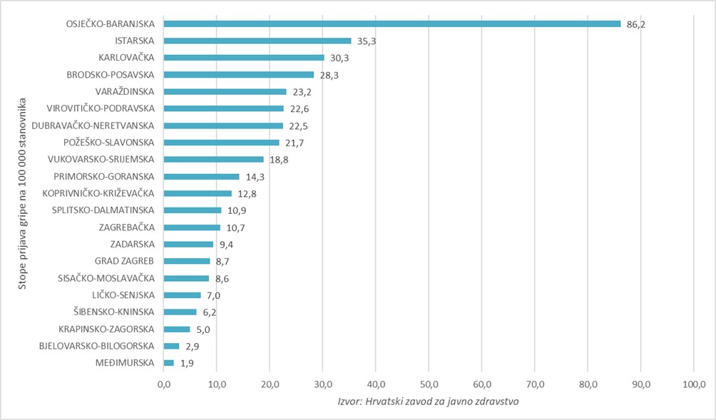 Slučajevi gripe prijavljeni su iz svih dijelova zemlje, no u petom tjednu najveća stopa oboljelih na 100.000 stanovnika zabilježena je u Osječko-baranjskoj županiji – 86,2 slučaja. Slijedi Istarska županija s 35,3 prijavljena slučaja na 100.000 stanovnika.