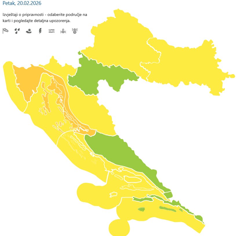 “Budite na oprezu zbog krhotina koje lete nošene jakim vjetrom. Mogući su lokalizirani prekidi u aktivnostima na otvorenom”, upozorava DHMZ. Žuto upozorenje na snazi je od 10 do 20 sati.