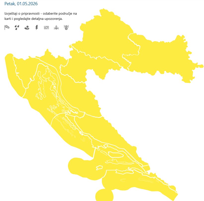 Državni hidrometeorološki zavod (DHMZ) za petak 1. svibnja je izdao meteoalarm za područje cijele Hrvatske
